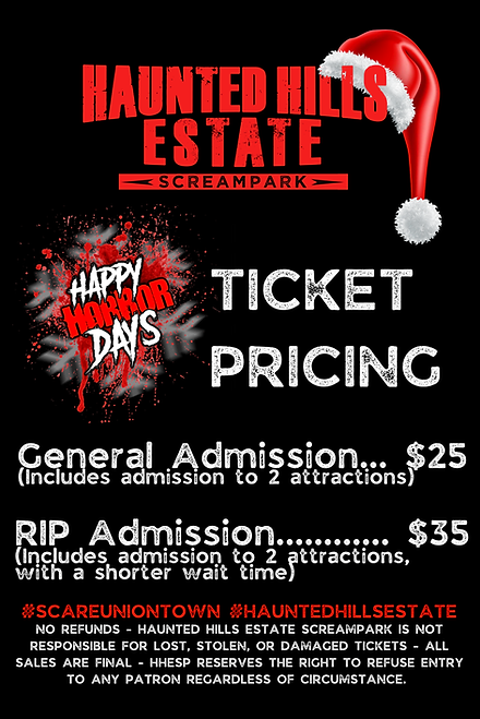Step into a chilling holiday experience at Haunted Hills Estate's Happy Horror Days! This eerie twist on festive cheer combines the magic of the season with spine-tingling frights. Wander through festively decorated rooms haunted by Christmas spirits, creepy elves, and twisted holiday nightmares. Dare to face the horrors lurking behind the twinkling lights—where every sleigh bell rings with a sinister jingle.